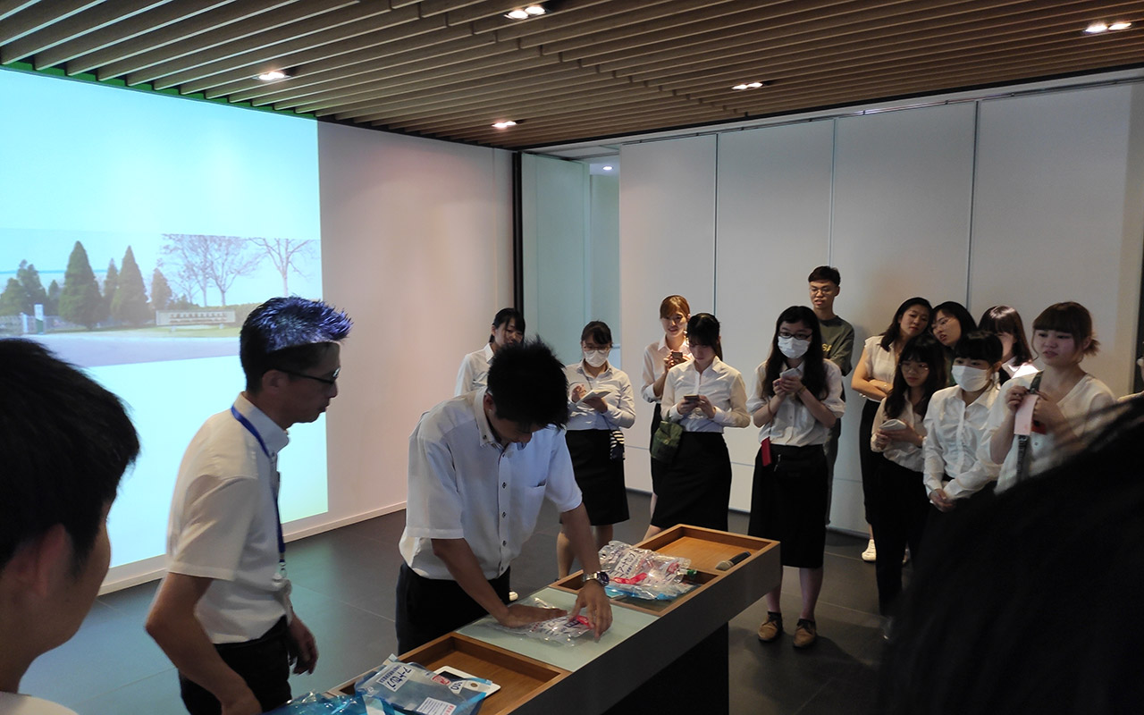 下午,學(xué)生們?cè)谔旖蛲鈬Z大學(xué)領(lǐng)隊(duì)的帶領(lǐng)下抵達(dá)工廠,吉川副總首先對(duì)工廠的整體概況做以簡(jiǎn)單介紹,隨后開始工廠參觀。在輸液展覽室,吉川副總分別對(duì)輸液的發(fā)展歷史、公司產(chǎn)品做了詳細(xì)講解,大家親自體驗(yàn)易撕膜和塑料安瓿的開啟方法,便捷且安全的操作方式讓學(xué)生們體會(huì)到醫(yī)藥行業(yè)的發(fā)展與進(jìn)步。在“未來輸液區(qū)”,吉川副總著重介紹了多腔袋產(chǎn)品,為學(xué)生們?cè)敿?xì)講解各小室的成分、原理和使用方法,并利用樣品進(jìn)行親自示范,學(xué)生們十分好奇,體驗(yàn)后紛紛驚嘆于技術(shù)進(jìn)步為人類生活帶來的更多便利。